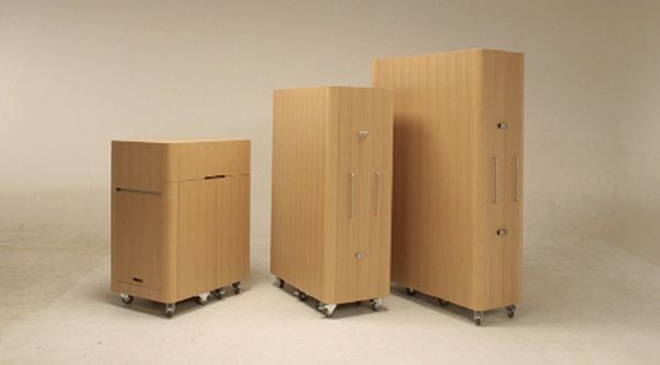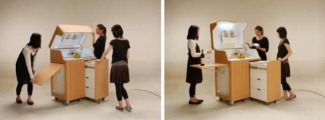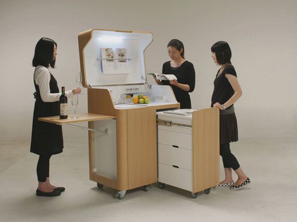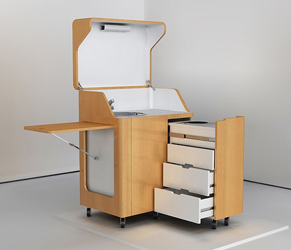 Este mueble arquitectónico cuenta con calentador de cocina, fregadero y estantes en un tamaño compacto. Aunque parece una caja a primera vista, una práctica mini cocina aparece cuando se abre.