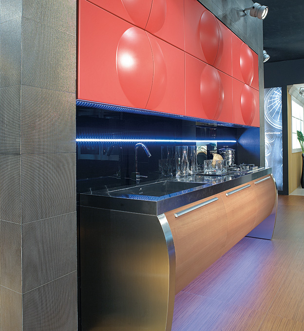Las características audaces de estas cocinas de Aster Cucine, que no se preocupan por lo convencional, la hacen diferente a cualquier otra en cuanto al diseño. Las puertas y frentes curvos y arqueados, le aportan un aspecto moderno y futurista sin detrimento de su funcionalidad.