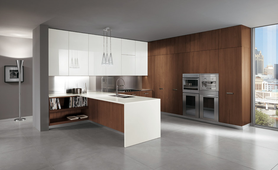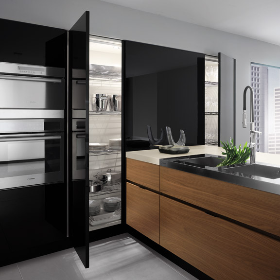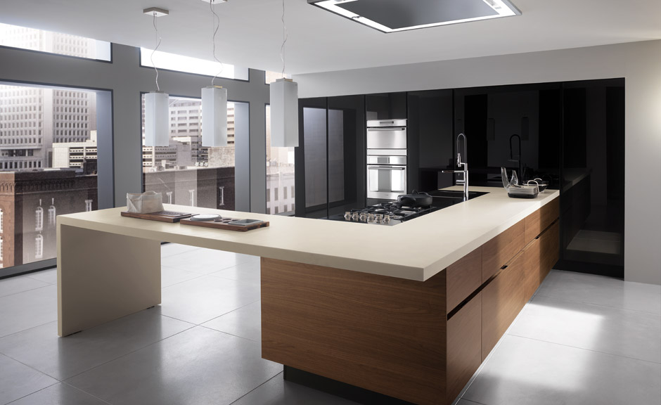 En estas series de Ernestomeda, podemos apreciar cómo se puede utilizar este material, combinándolo con aceros, laminados y lacados de diferentes colores y con encimeras de Corian o Silestone para darle esa estética elegante y al mismo tiempo moderna y minimalista.