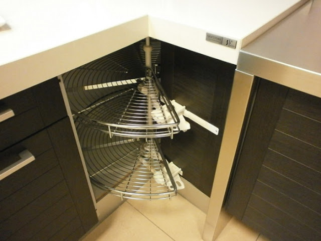 Sistema Space Corner de Blum, perfecto para el almacenaje en rincones de gran cantidad de pequeños artículos.