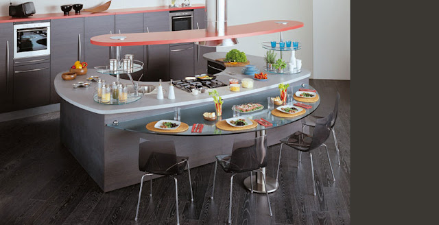 Barra semicircular de cristal con pata cilíndrica y está adosada a la isla pero a altura de mesa.