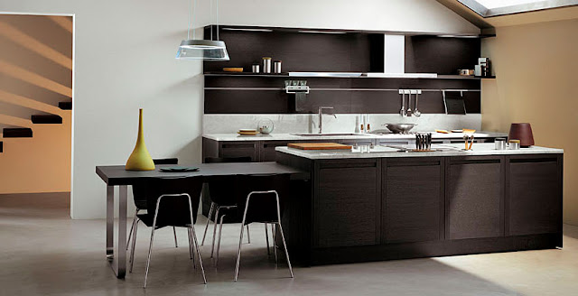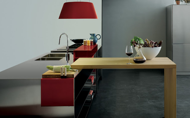 En este caso la mesa incorporada a la isla, es de madera con una base metálica.