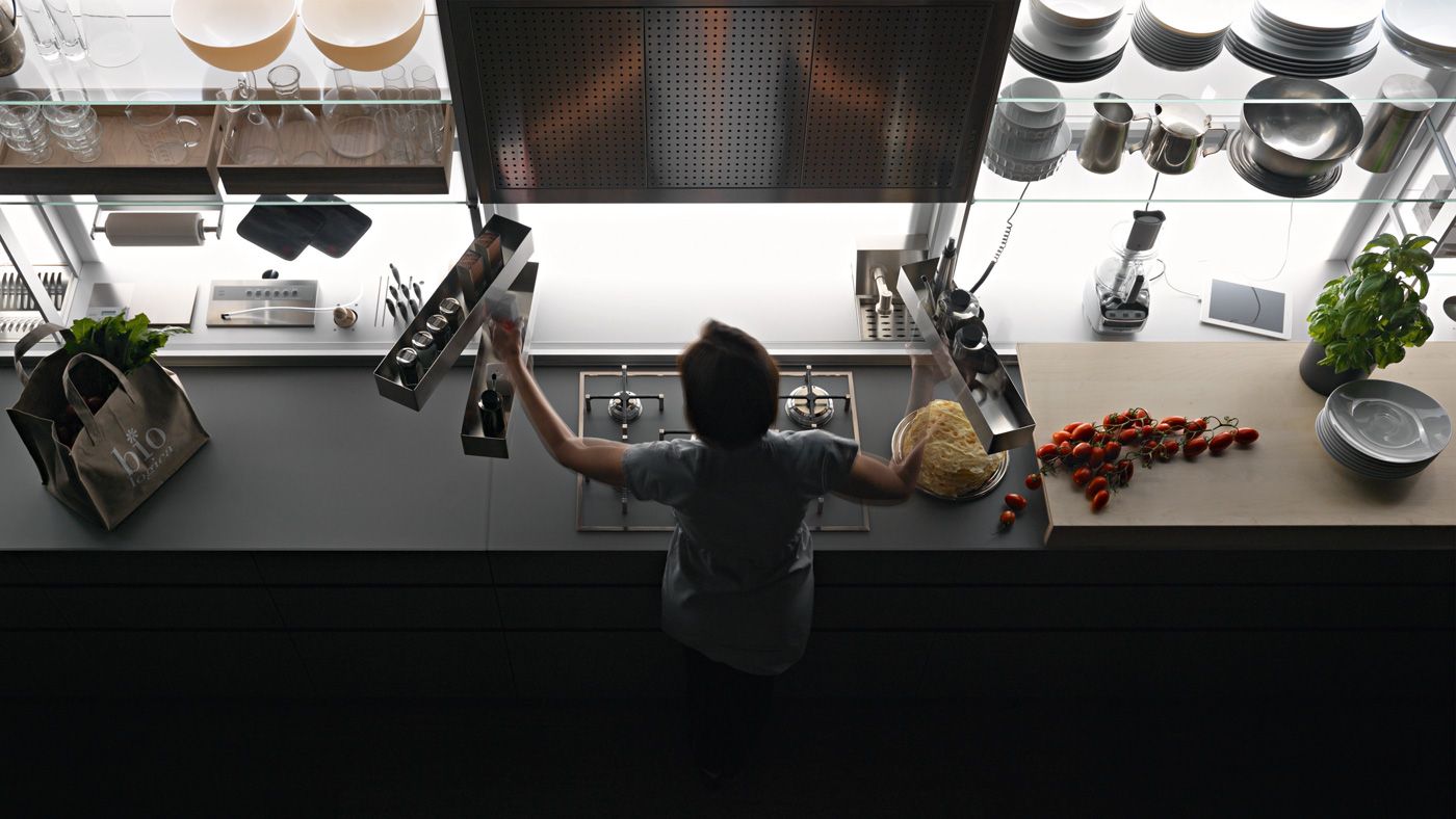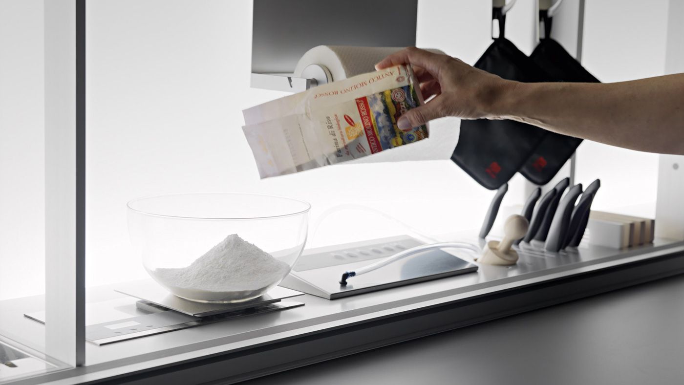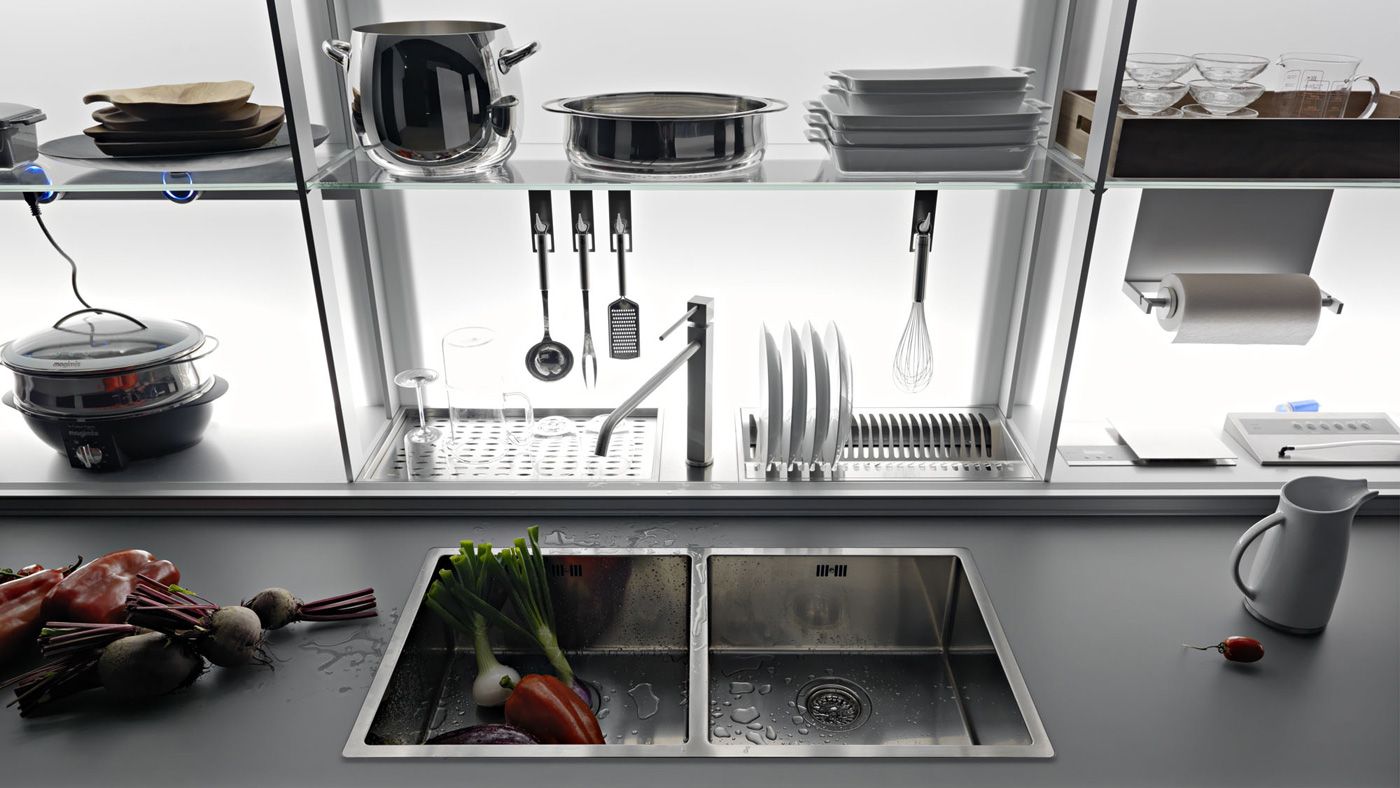 Desde un escurridor de platos, básculas, pequeños electrodomésticos, recipientes de cocción desmontables, tomas de corriente, monitor, portarrollos de cocina, grifo, ganchos para utensilios hasta una campana, siempre manteniendo la superficie de 60 cm libre para preparar alimentos.