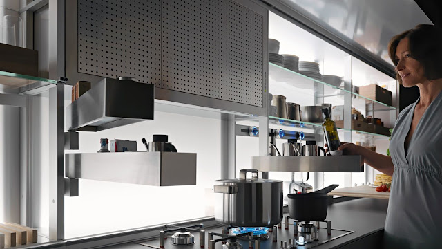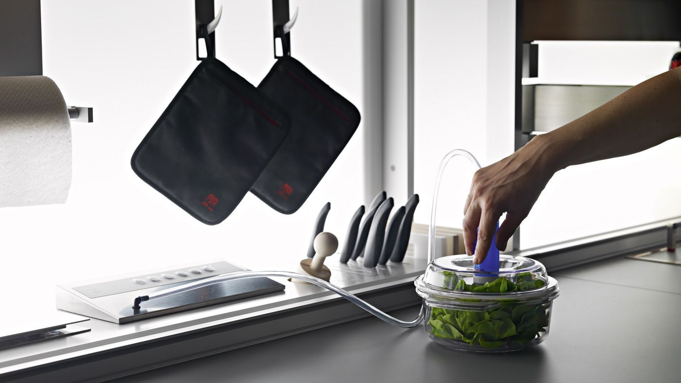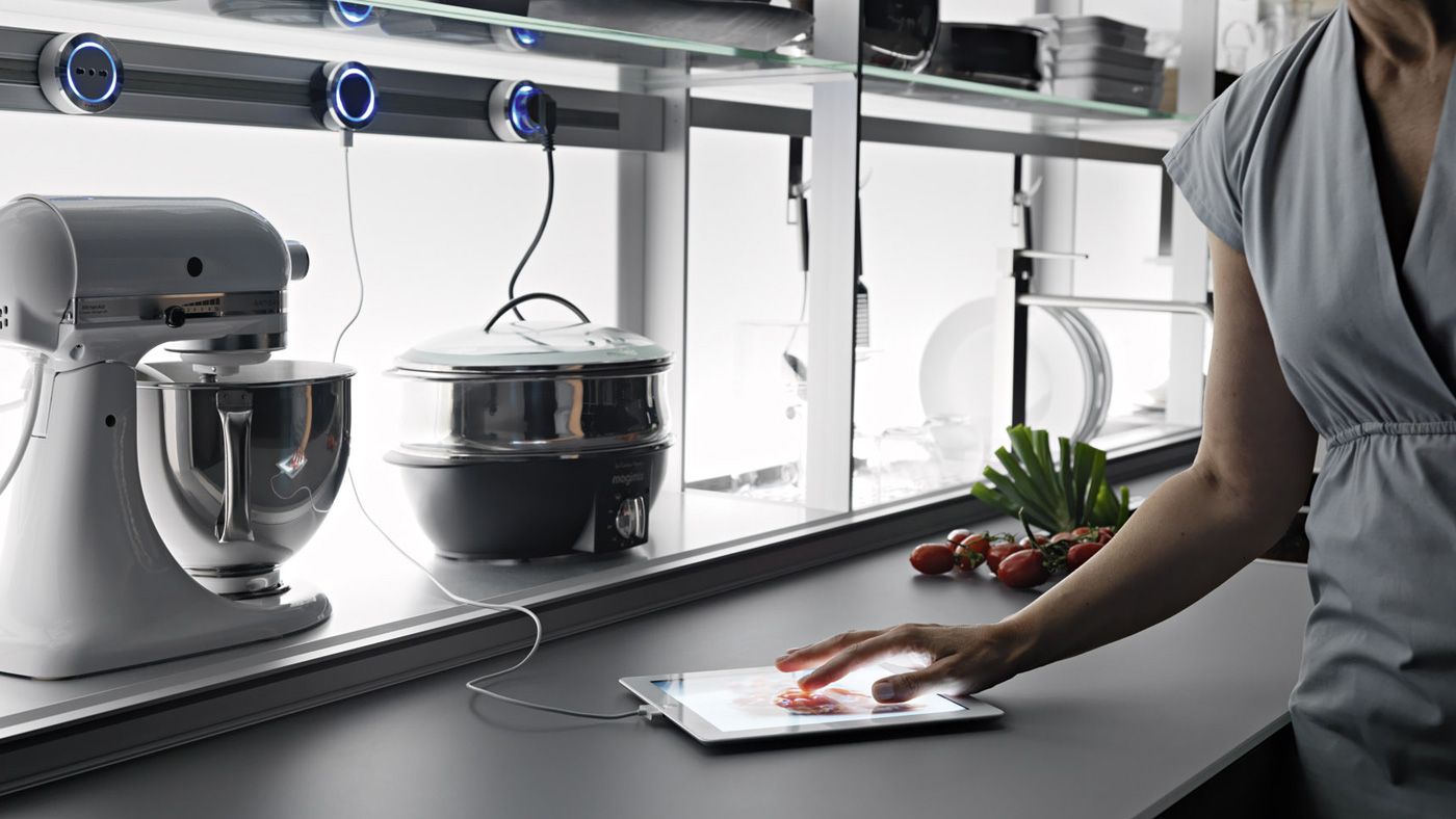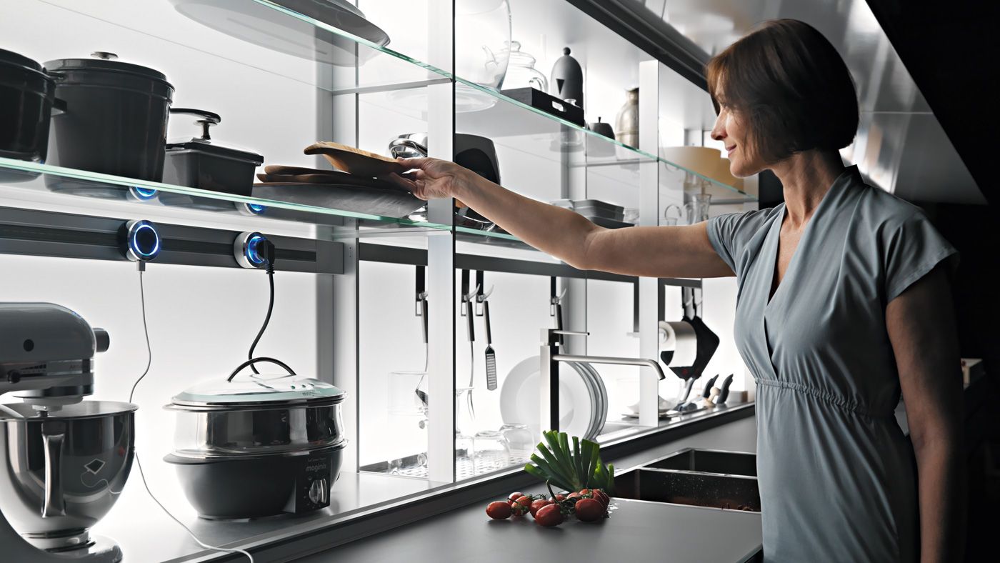 Desde un escurridor de platos, básculas, pequeños electrodomésticos, recipientes de cocción desmontables, tomas de corriente, monitor, portarrollos de cocina, grifo, ganchos para utensilios hasta una campana, siempre manteniendo la superficie de 60 cm libre para preparar alimentos.