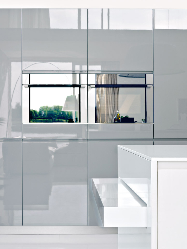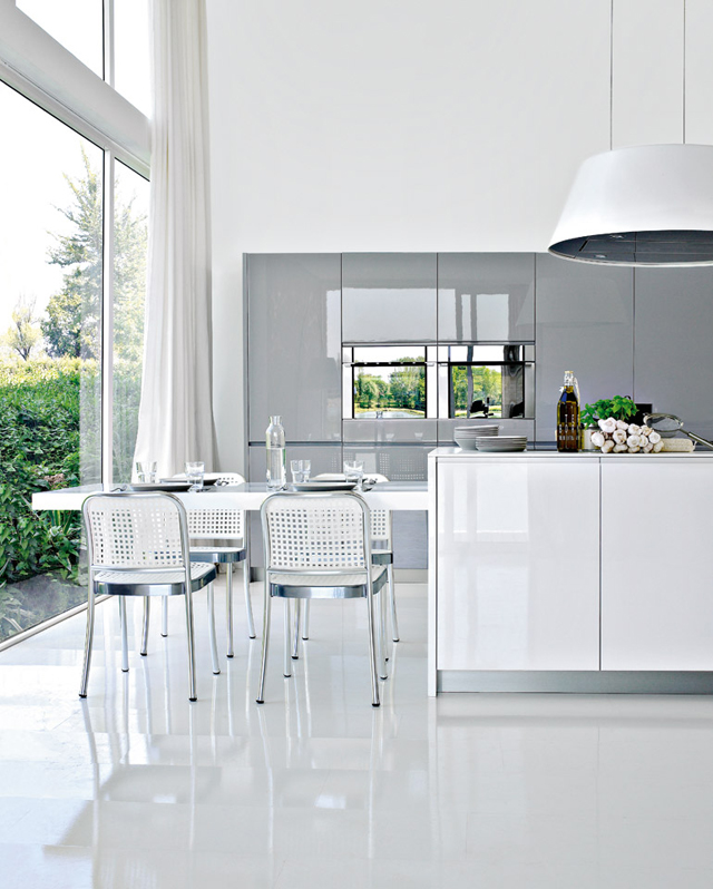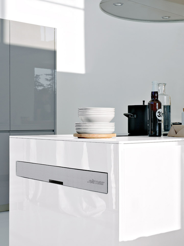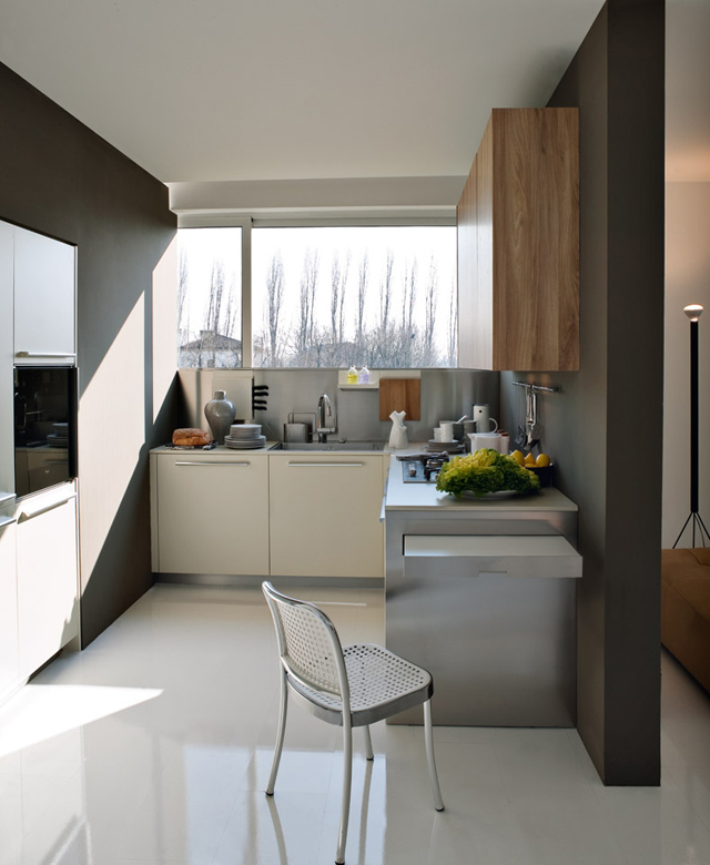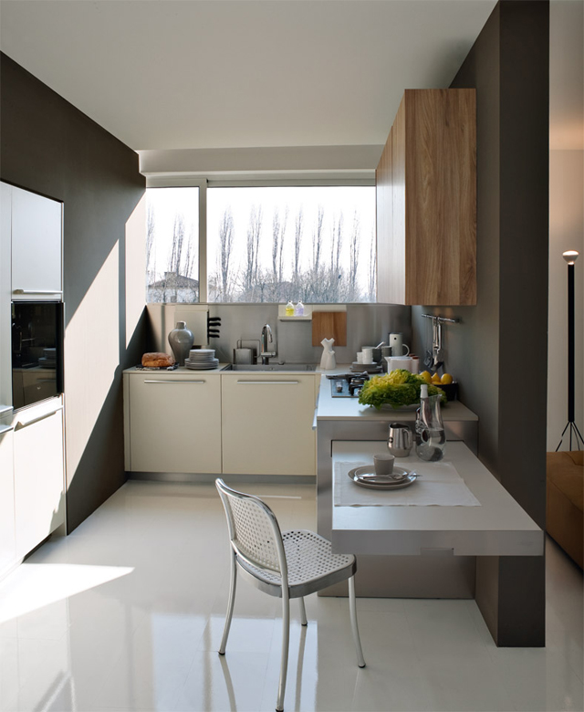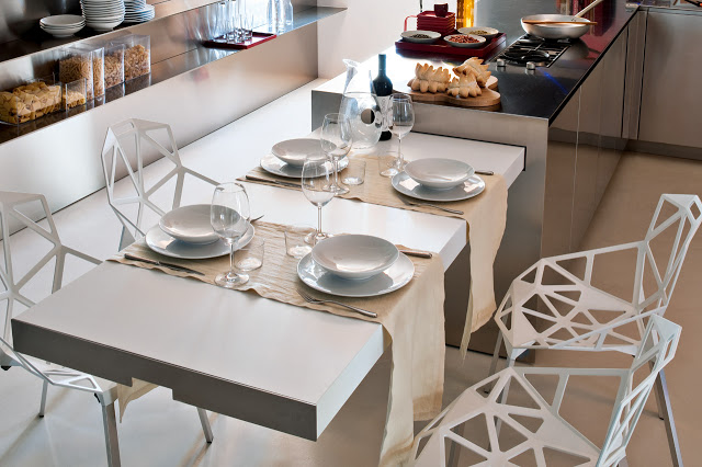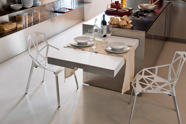 Esta super práctica mesa Easy table de Elmar Cucine se puede fácilmente incorporar a diseños adosados a la pared, península o isla, para una longitud mínima de los muebles bajos de 180 cm que deben estar preparados para esconderla.