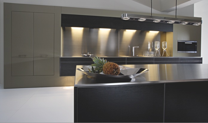El acero inoxidable también desempeña un papel fundamental en la encimera de trabajo y los paneles traseros.
