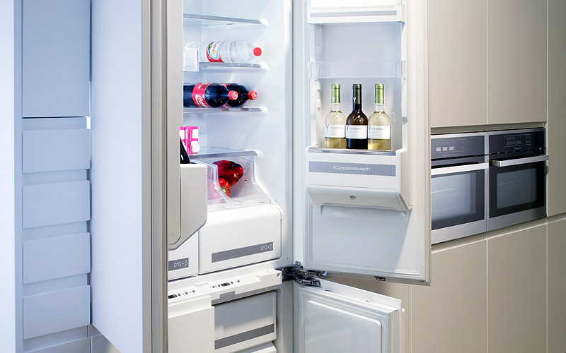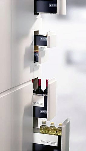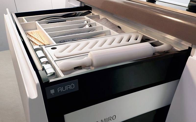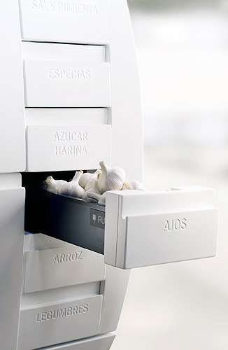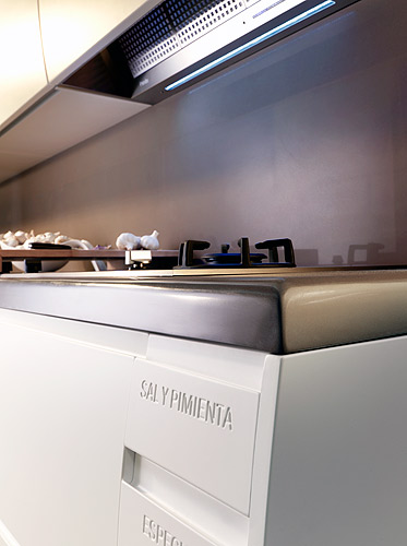 Las líneas curvas de los frentes lacados blanco mate, los tiradores integrados en los cantos y los pequeños cajones identificados con los nombres de su contenido en bajo relieve, son algunas de las señas de identidad de esta serie.