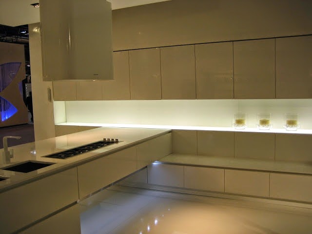 La línea de luz blanca de debajo de la encimera destaca las líneas puristas reducidas de la cocina.