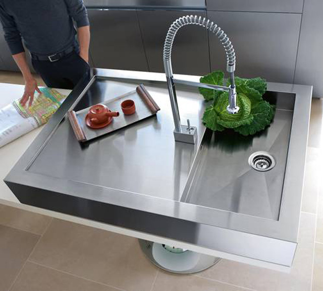 El fregadero con el escurridor plano e inclinado hace que el agua se evacúe fácilmente.