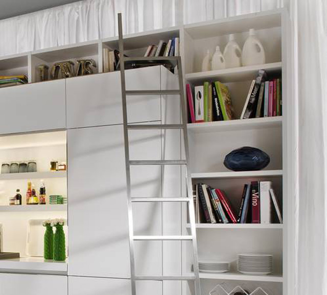 Los estantes abiertos de los armarios de la cocina a manera de librería le dan nombre a este modelo. Tanto para guardar utensilios de cocina o libros, permite eliminar la línea separadora entre la cocina y el salón.