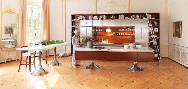 En esta otra composición, la isla permite almacenar, preparar y cocinar todo y la encimera de mármol le aporta a la cocina un carácter particular sobre el par de módulos Trumpet Tables.