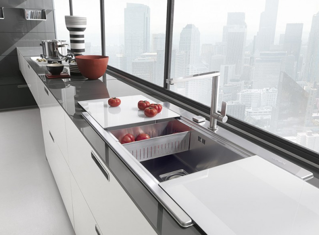 Este gran fregadero con tapa, además de servir para cortar y preparar alimentos, puede ocultarlo convenientemente.