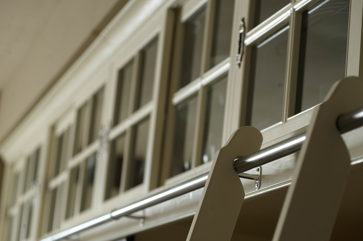 La escalera descansa sobre una barra de acero para facilitar el acceso a las vitrinas superiores, además de convertirse en un elemento decorativo.