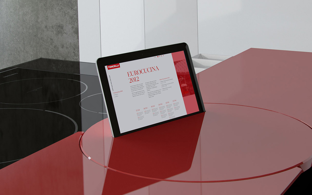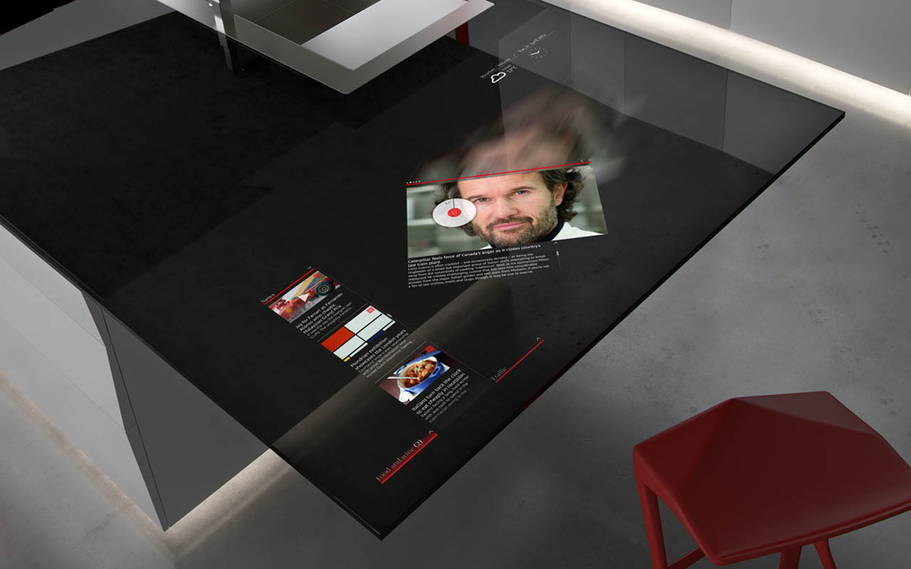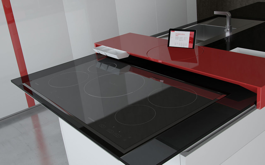 La superficie de trabajo de esta cocina contiene un sistema interactivo y pantalla táctil Samsung, instrumento de alta tecnología con conexión a internet, además de una base giratoria para integrar la tablet.
