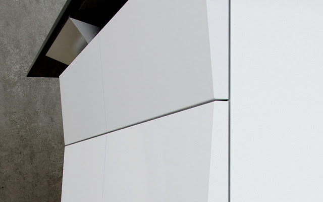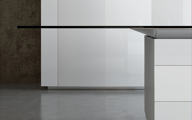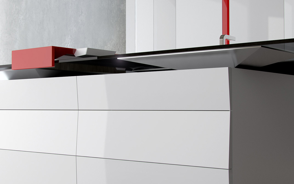 Compuesto por una encimera de vidrio negro y los frentes de puertas y cajones sin tiradores y lacados en blanco, con un aspecto prismático que le da el nombre a esta serie.
