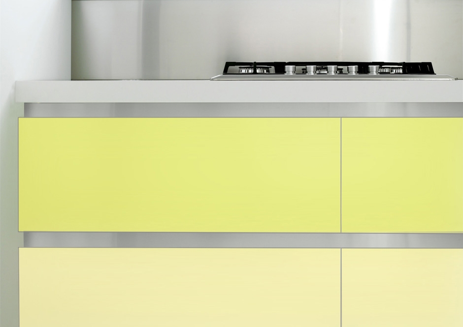La frescura de los colores ácidos y el azul de este estupendo conjunto, le otorga además una gran vitalidad y energía al ambiente. Las puertas y frentes laminados brillantes con los 4 cantos de aluminio y con gola también de aluminio, que evita los tiradores, la hacen ligera.