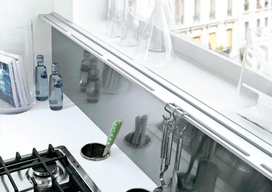 La asimetría de los muebles altos y bajos, deja un discreto pero estudiado espacio para, por ejemplo, un carrito de servicio. La repisa de cristal es un elemento que, además de ser decorativo, desahoga la encimera. Es el modelo Croma de Maistri.