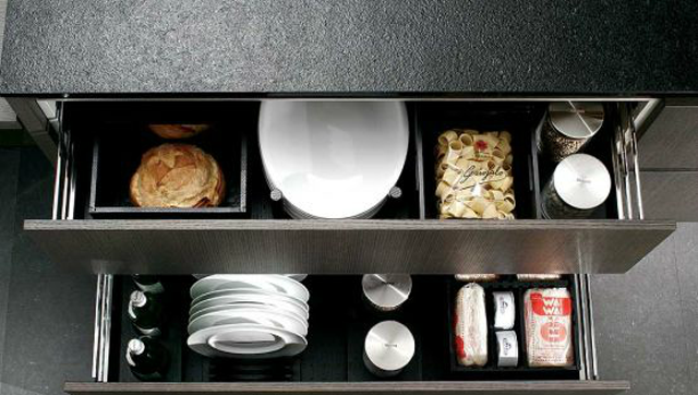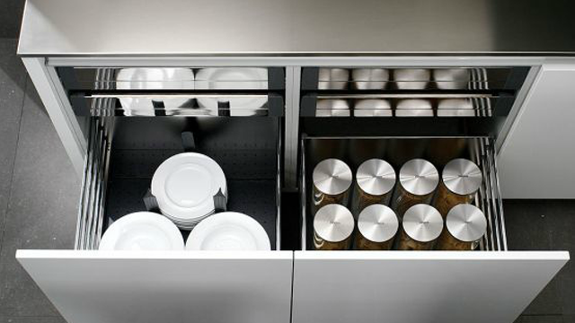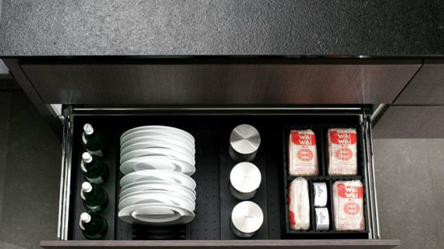Arriba, los cajones interiores están equipados con cubiertos y utensilios. Abajo, los platos se disponen apilados y con separadores para evitar que se muevan. Los botes cuentan con una base que los fija.