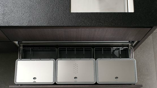 Debajo del fregadero un cajón superior está provisto de pequeñas bandejas para jabones, detergentes, esponjas y otros elementos para limpieza.