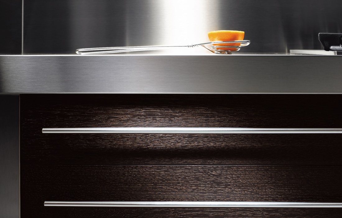 Los tiradores de barra de acero a medida de cajones y puertas le dan el toque personal a este modelo Oxalys de la firma francesa Perene.