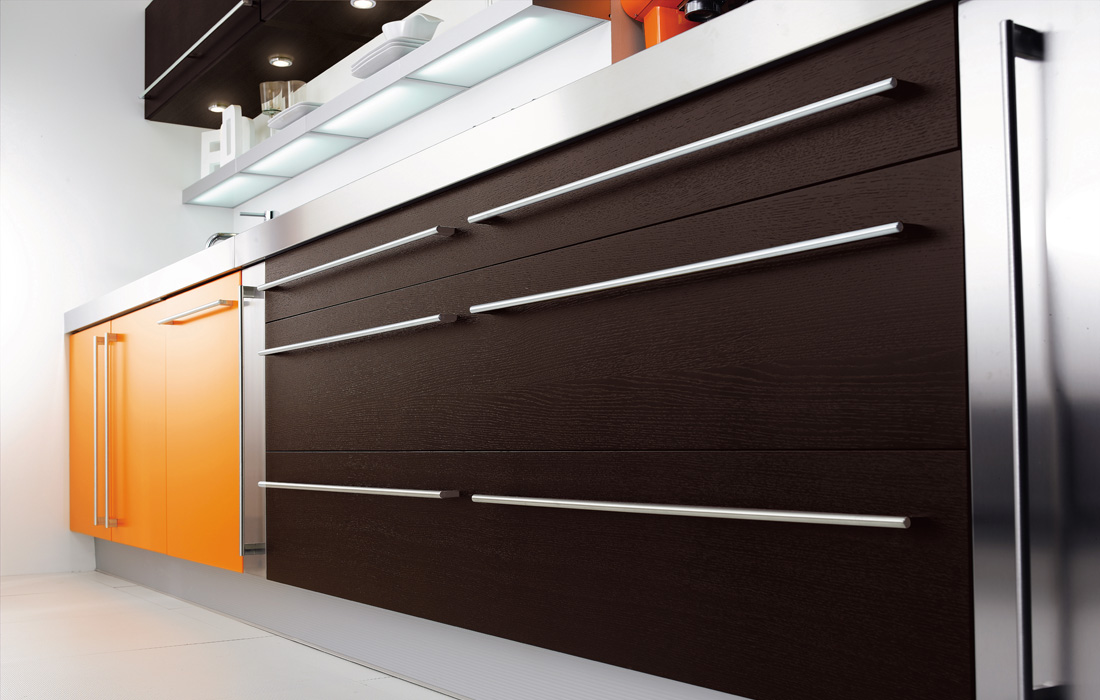 Los colores y materiales de este diseño son totalmente diferentes pero se complementan extraordinariamente bien. El laminado naranja y el chapado en madera wengué forman casi dos mitades perfectamente definidas para completar un conjunto alegre pero elegante.