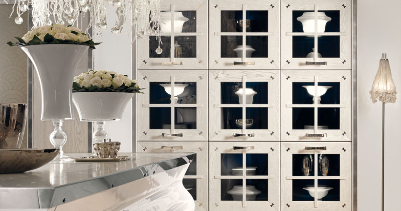 Por otro lado, puertas enmarcadas con detalle en su inglete y vitrinas con palillería para los que aprecian y entienden el estilo clásico. Es el modelo Papillon de la firma italiana Brummel.