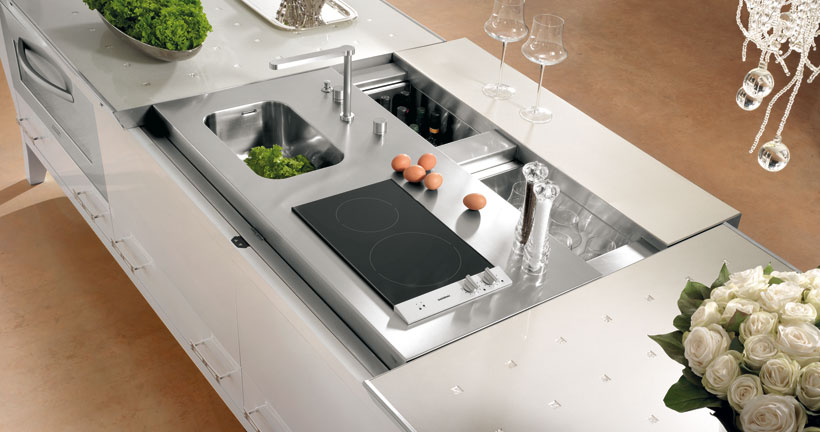 Un ejemplo de ello está en la preciosa isla y su encimera de acero inoxidable deslizante, que deja al descubierto una zona de trabajo completa, con fregadero integrado, placa de cocción y zonas de conservación.