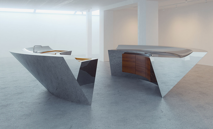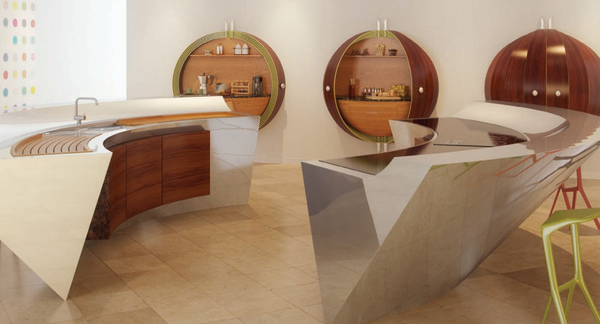 Evidentemente no es una cocina convencional, sino un ejercicio de diseño e imaginación que reta a la gravedad y la convierte en casi una obra escultórica.