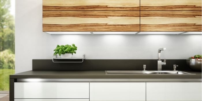 La clave es que son solo detalles, uno en cada sector, sin recargar ni disputar el predominio del color blanco. Los dos muebles altos abatibles en nogal natural y con marcadas vetas, destacan sobre la zona del fregadero, que se complementa con los laterales hasta el suelo del mismo material de la encimera.
