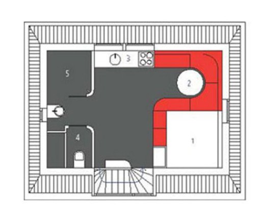 La cocina compuesta por 4 módulos bajos, que continúan para convertirse en base de un banco circular para la mesa redonda y en prácticos contenedores bajo la zona del dormitorio. Un diseño que se basa en el todo y no solo en las partes.