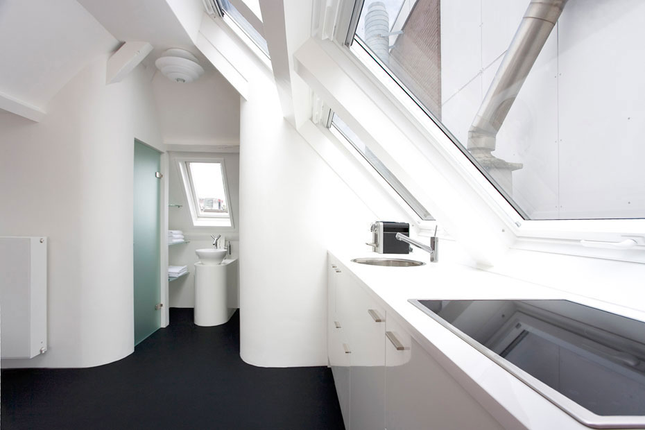 La continuidad de las líneas en este pequeño apartamento holandés, enlazan los ambientes sin transiciones, sin cortes ni separaciones.