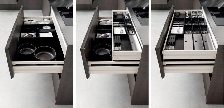 Con una estética sin tiradores y frentes con cantos a 45º para su apertura, conforma un lugar acogedor y con personalidad. Los muebles, además de un diseño elegante y de alta calidad, deben ofrecer máxima funcionalidad como sus cajones y puertas con autocierre o las puertas de acero retráctiles de las despensas.