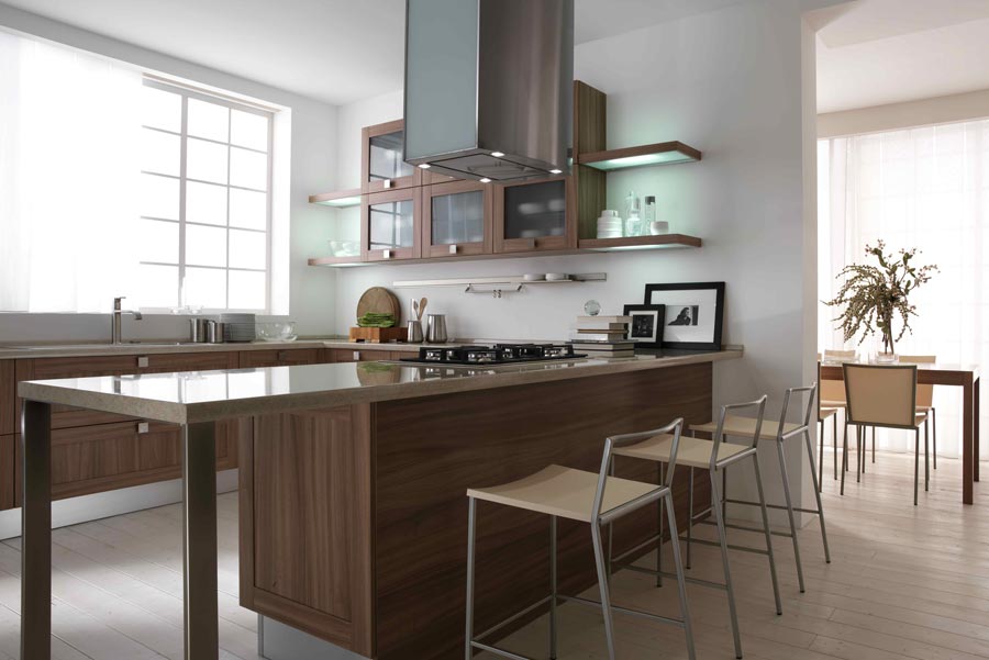 Con un acabado blanco a poro abierto, por ejemplo, su aspecto es joven y alegre sobre todo si se combina con unos muebles altos abatibles de cristal de color.