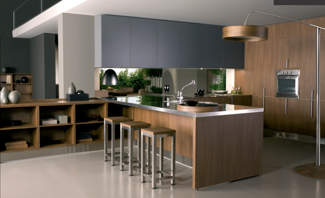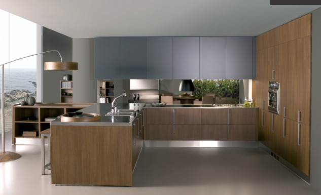 Tan importantes pueden ser los materiales como la disposición de la cocina. La madera ofrece calidez y elegancia, el azul liso, un suave toque de color y la encimera de acero inoxidable, el aire moderno y sencillo.