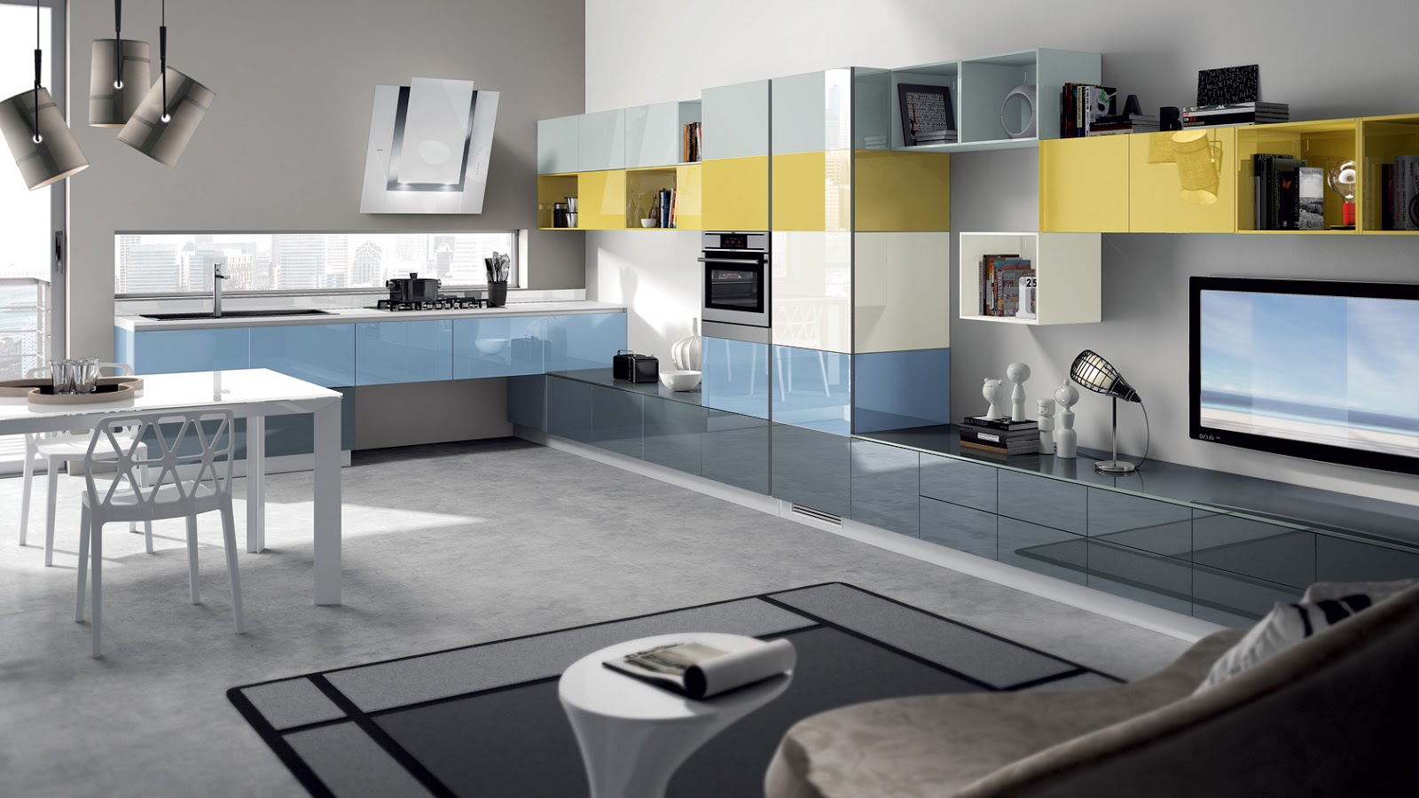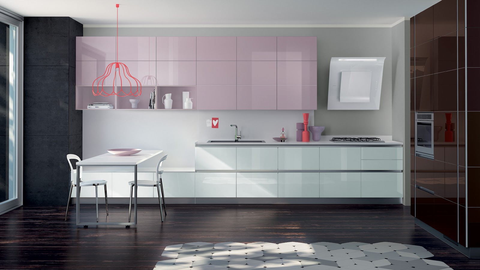 Las puertas están realizadas con paneles recubiertos de vidrio, sin tiradores visibles y los muebles abiertos lacados en una buena variedad de colores.