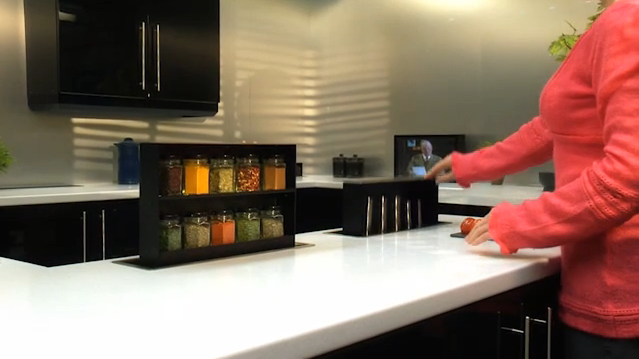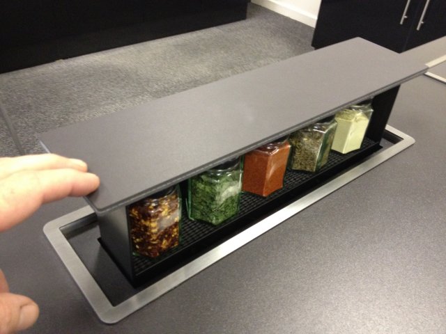Se trata de una pequeña caja embutida en la parte trasera de la encimera de trabajo, justo en el espacio perdido de los muebles bajos, que con un suave toque en la tapa superior, se eleva para mostrar el contenido con la opción elegida.