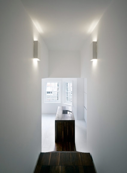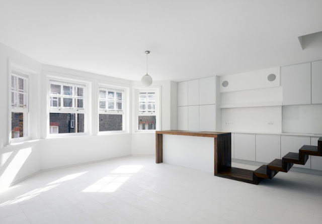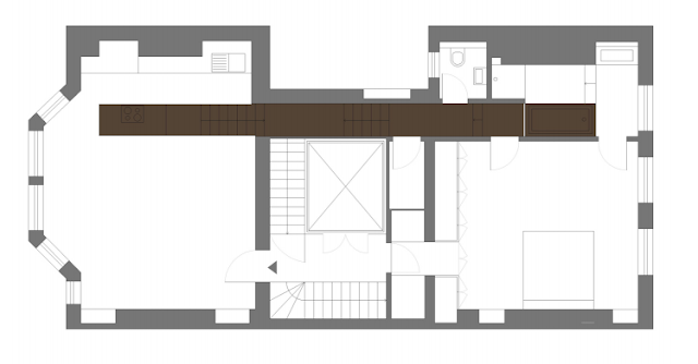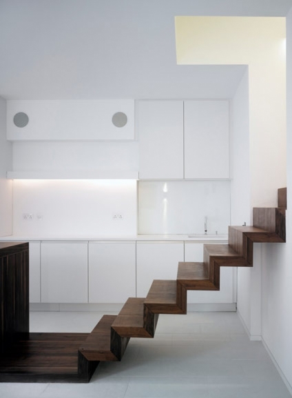 La superficie de trabajo de esta cocina, se extiende a lo largo de la vivienda, convirtiéndose en escaleras y terminando en el contorno de la bañera.