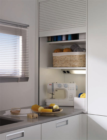 En el mueble de persiana, hasta una máquina de coser se puede guardar, además de lo necesario para la costura. Los tomacorrientes y la iluminación hacen esta zona un lugar de trabajo más funcional.