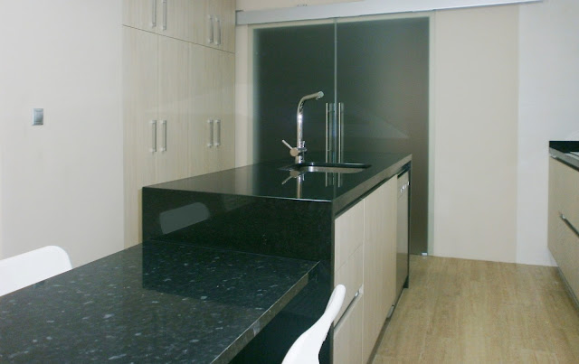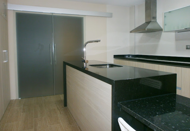 Detrás de la isla, dos grandes armarios sirven para esconder la lavadora y secadora, artículos de limpieza y escobero. Las puertas correderas de cristal traslúcido, pueden dejar comunicadas la cocina y el salón-comedor o independizarlas cuando se desee.