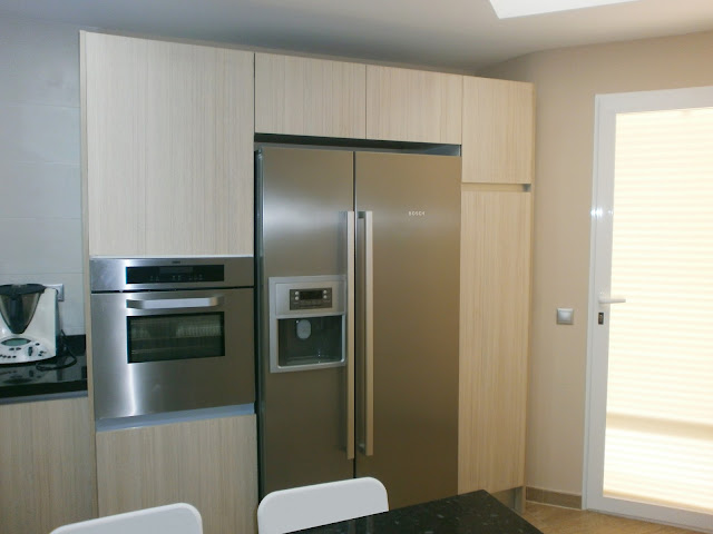 Un solo mueble alto abatible y con puerta de vitrina con marco de aluminio decora la pared junto a la campana decorativa y a continuación, las columnas del horno y microondas, frigorífico y despensa.