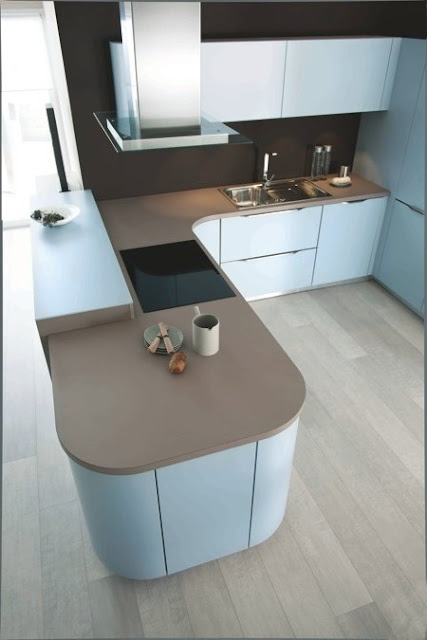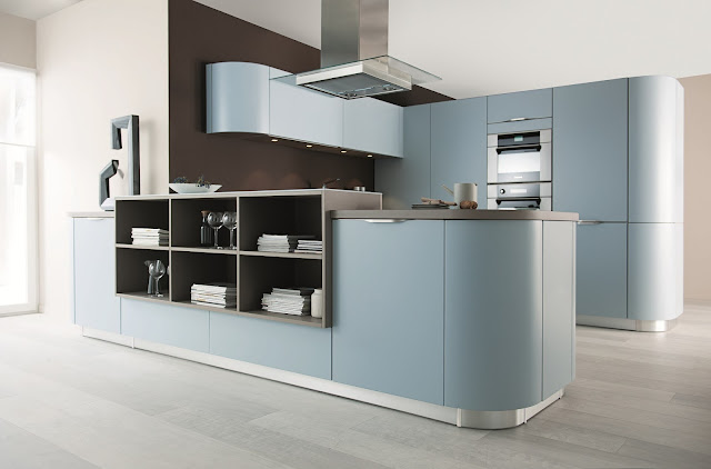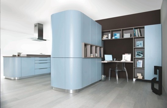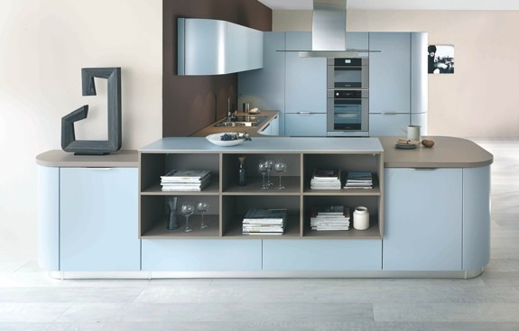 La combinación de colores de los llamados fríos como este nordik blue en los muebles, la encimera marrón glacé y los estratégicos elementos decorativos abiertos, crean una atmósfera acogedora que propicia inspiración y placidez.