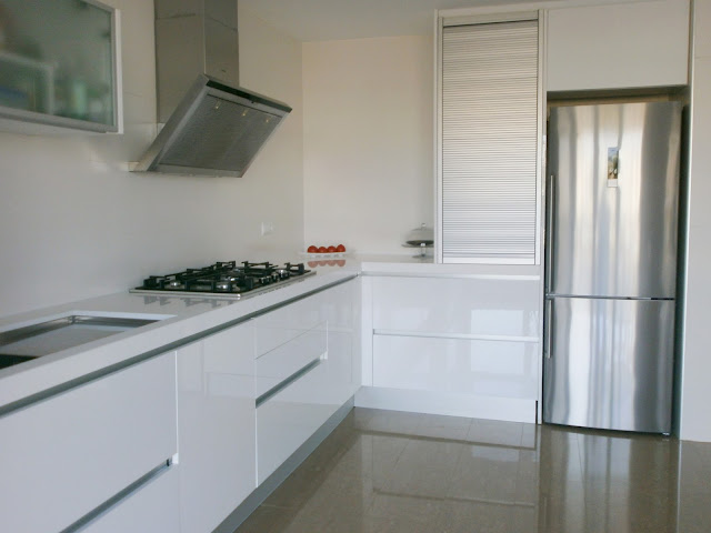 Este modelo sin tiradores -con gola de aluminio- es un laminado de alto brillo que ofrece un extra de luminosidad al estilo minimalista del mobiliario.