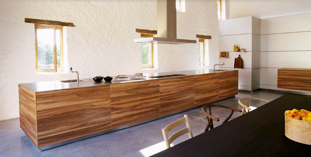 El elegante mobiliario de bulthaup b3 con frentes chapados en madera de manzano con sus marcadas vetas, es muy apropiado para esta finca agrícola francesa reconvertida en talleres para artistas, donde esta cocina comunitaria se ha convertido en el centro de actividades del lugar.