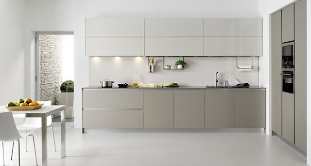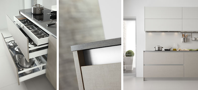 El modelo es un laminado estratificado color lino y gris claro brillo de la marca española Dica, sin tirador -con perfil gola de aluminio- y con encimera de Silestone gris. Funcionalidad al máximo.