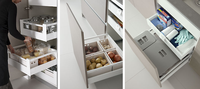 Enfrente, muebles de columna para lavadora y secadora -necesariamente de mayor profundidad y anchura- y muebles para plancha, ropa, artículos de limpieza, aspirador y accesorios. Zonas separadas para optimizar funciones distintas.