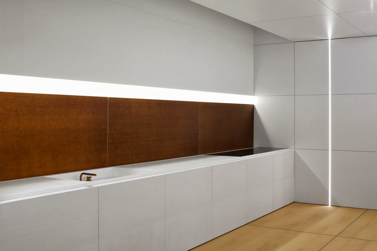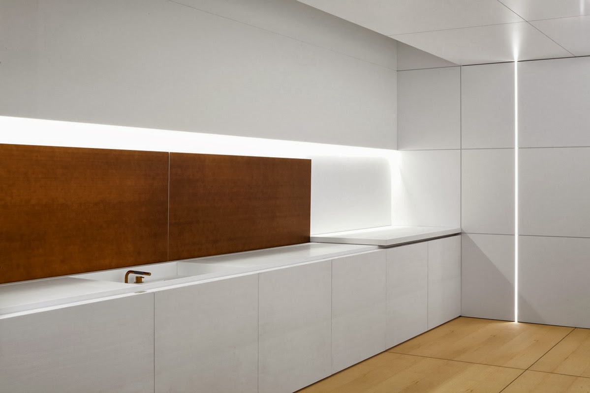 Se trata de una gran isla de trabajo y muebles en columna, a manera de paredes, que se debe abrir para poder usar, por ejemplo, el horno, el frigorífico o simplemente para sacar los platos de la próxima cena. Buscan una gran simplicidad de líneas, para que la cocina pase casi inadvertida, pero con todas las comodidades para hacer de la preparación de una sencilla comida, un momento especial.