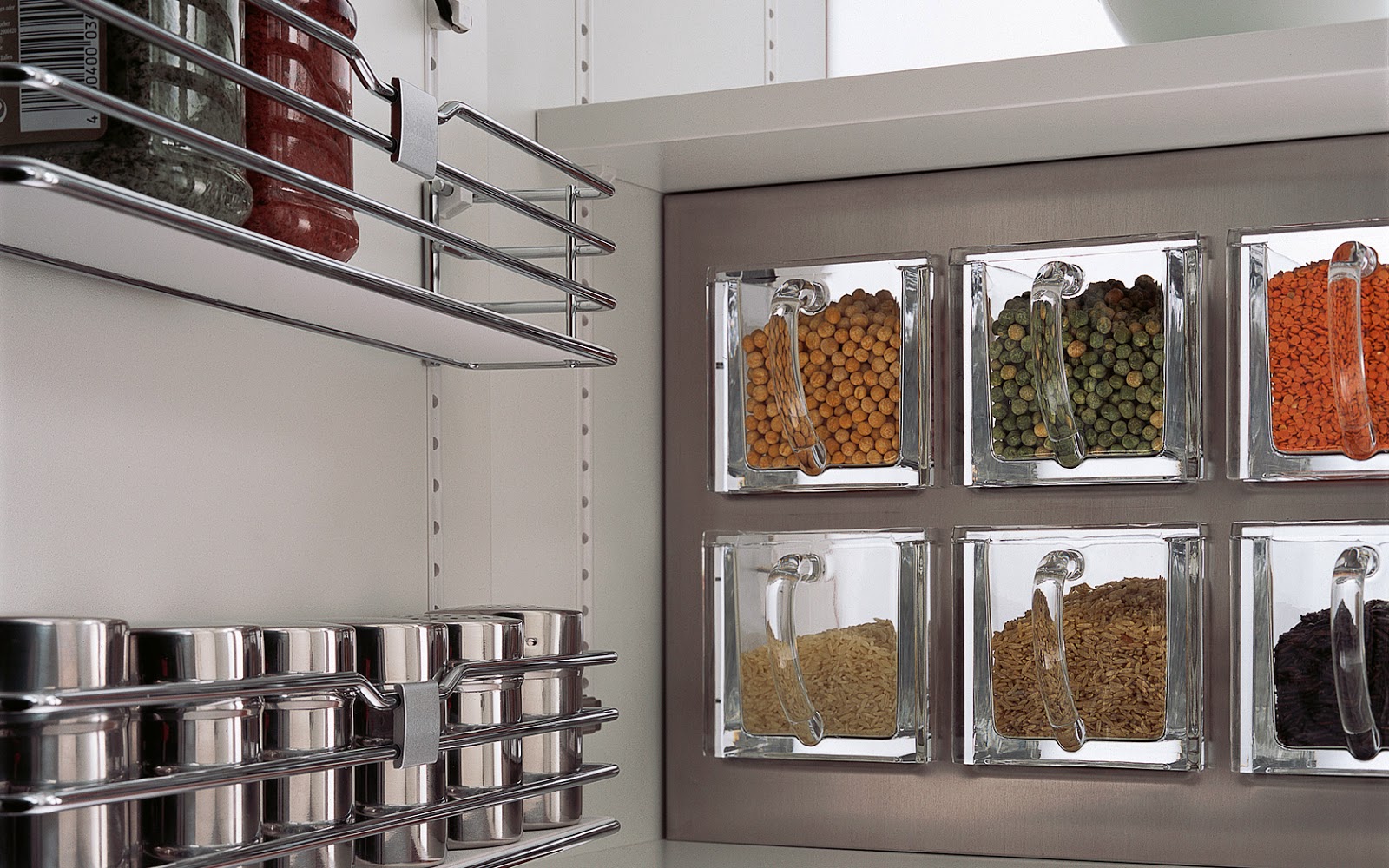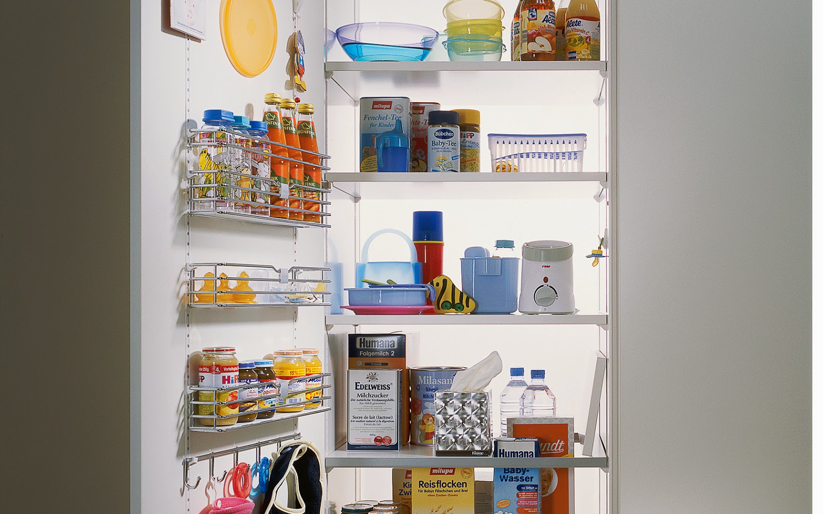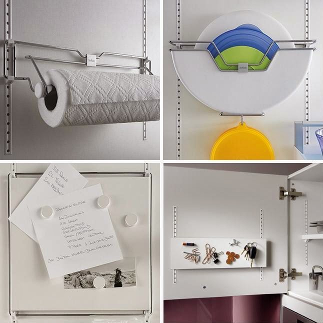 Asimismo, un clip soporte para piezas pequeñas, soporte para rollos de cocina, soporte tapas laminadas, pizarra magnética, estante magnético, juego de jarras, bandas tensoras, soporte para linterna, soporte para tapas, soporte para paños, cesta para especias, soporte para bolsas, cesta de provisiones, hasta un soporte para la báscula.