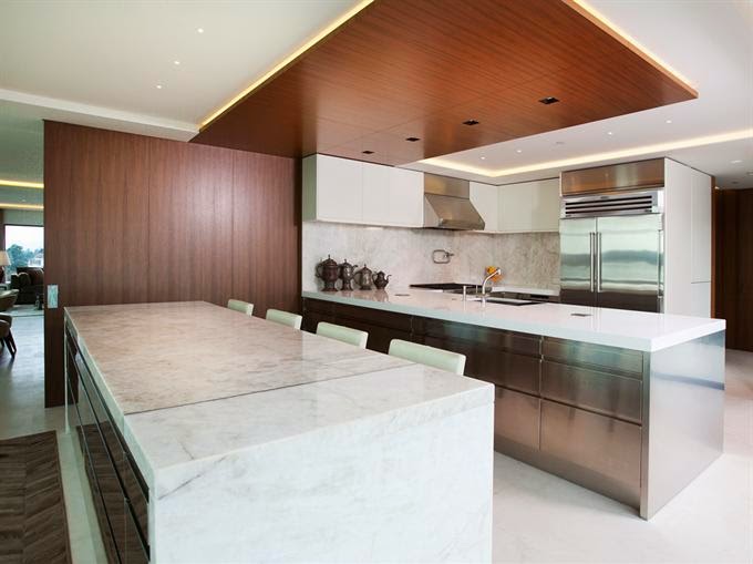 El modelo de líneas rectas no lleva tirador y la encimera de cuarzo blanco y los pocos muebles altos, suavizan la frialdad que desprende el mismo acero. El techo de madera limita visualmente los espacios y le da la calidez necesaria a este estupendo ambiente.
