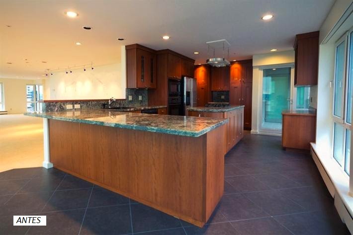 En esta reforma realizada en Vancouver, Canadá, por Euro Canadian Construction Corporation, se ha cambiado la distribución antigua por una configuración en U con una península para la zona de trabajo y la isla con barra en paralelo, donde las áreas están muy bien definidas.