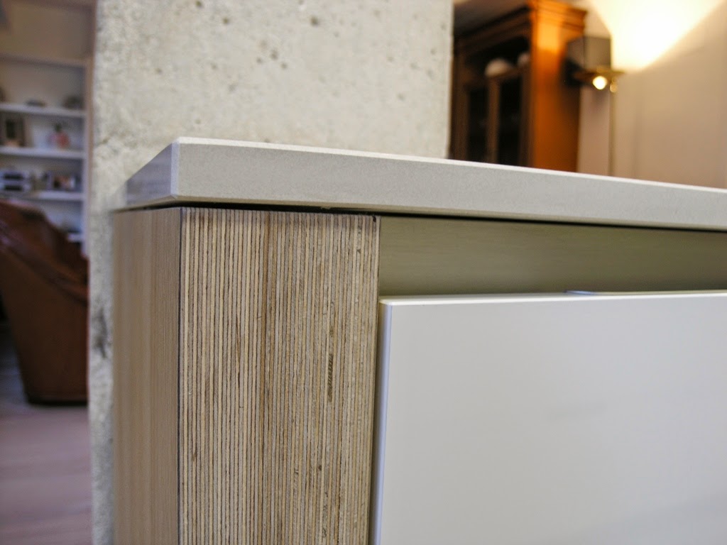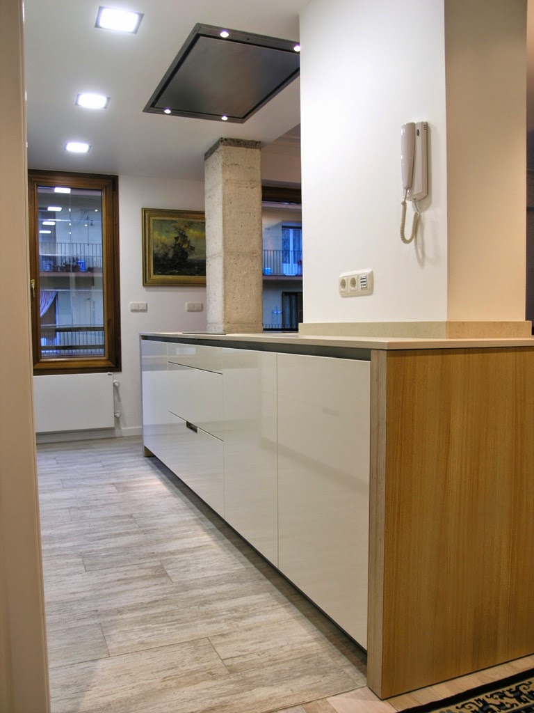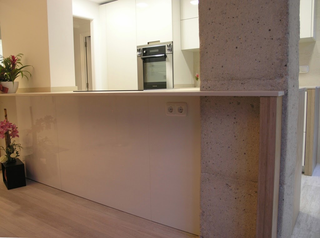 Esta bonita cocina de perfil minimalista, se adapta al entorno y marca la separación con el salón haciendo parte de su propio diseño a las dos columnas existentes.